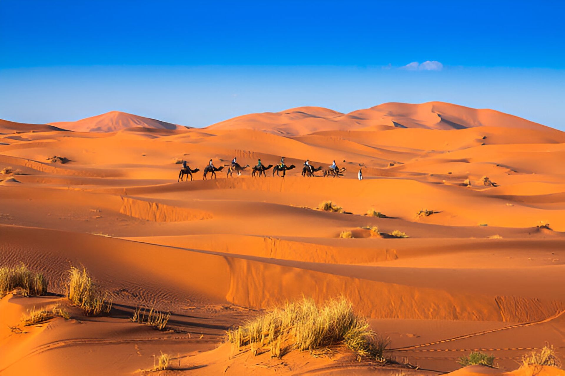 This 5-day journey from Fes travels through the Middle Atlas to Merzouga's Sahara desert for an oasis experience, then continues through Todra Gorge and the Valley of Kasbahs before concluding in Marrakech after visiting Ait Ben Haddou and crossing the High Atlas Mountains.